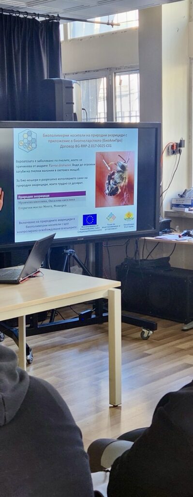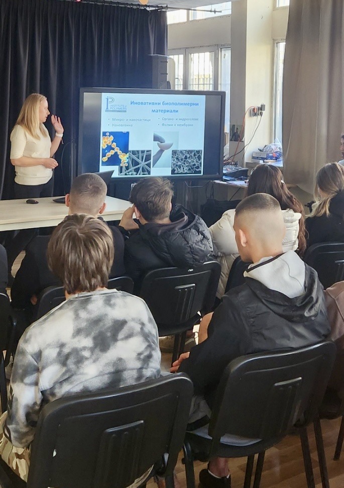 На 6 март 2026 г. гл. ас. д-р Десислава Будурова представи презентация на тема „Биополимери и биокомпозити – бъдещето на материалите“ пред учениците от специалност “Екология и опазване на околната среда“ в Професионална гимназия по екология и биотехнологии „Проф. д-р Асен Златаров“ – София. Също така, учениците бяха запознати с тематичните направление по които работи ИП-БАН и с резултатите от три текущи проекта, финансирани от Европейския съюз – СледващоПоколениеЕС (NextGenerationEU), Инвестиция C2I2 „Повишаване на иновационния капацитет на Българската академия на науките в сферата на зелените и цифровите технологии, Договори BG-RRP-2.011-0005-C01, BG-RRP-2.017-0025-C01 и BG-RRP-2.011-0018-C01.