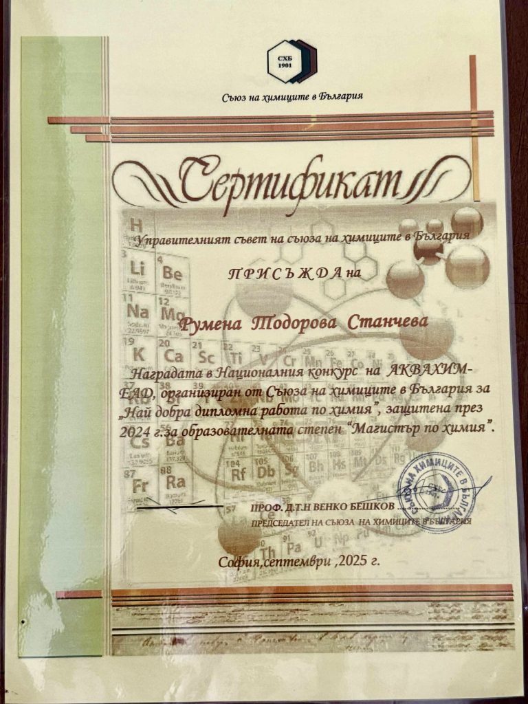 Румена Станчева спечели наградата „АКВАХИМ“ на Съюза на химиците в България за „Най добра дипломна работа“, защитена през 2024 г. за образователната степен „магистър“. В националния конкурс участваха дипломиралите се през 2024 учебна година химици и инженер-химици, придобили образователната степен „бакалавър“ или „магистър“ по различни химически специалности.