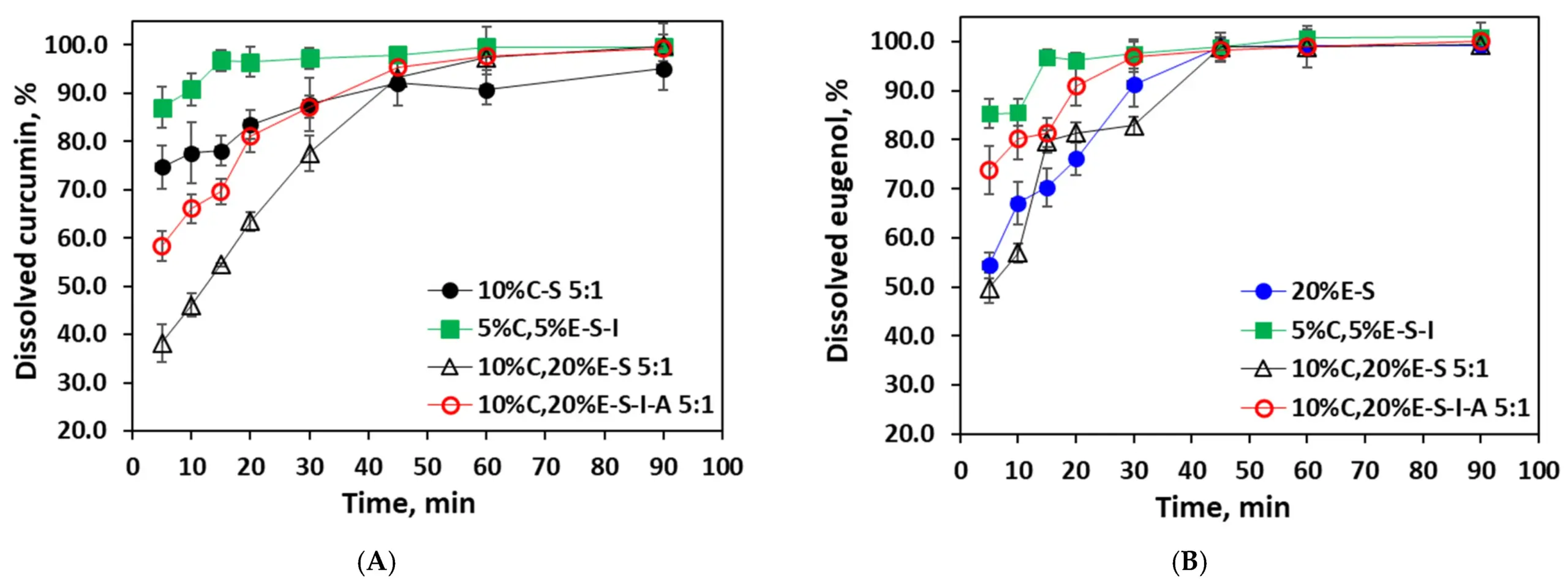 Water-Soluble Formulations of Curcumin and Eugenol Produced by Spray Drying