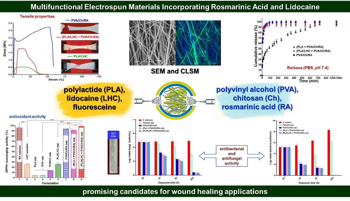 Multifunctional Electrospun Materials from Poly(Vinyl Alcohol)/Chitosan and Polylactide Incorporating Rosmarinic Acid and Lidocaine with Antioxidant and Antimicrobial Properties
